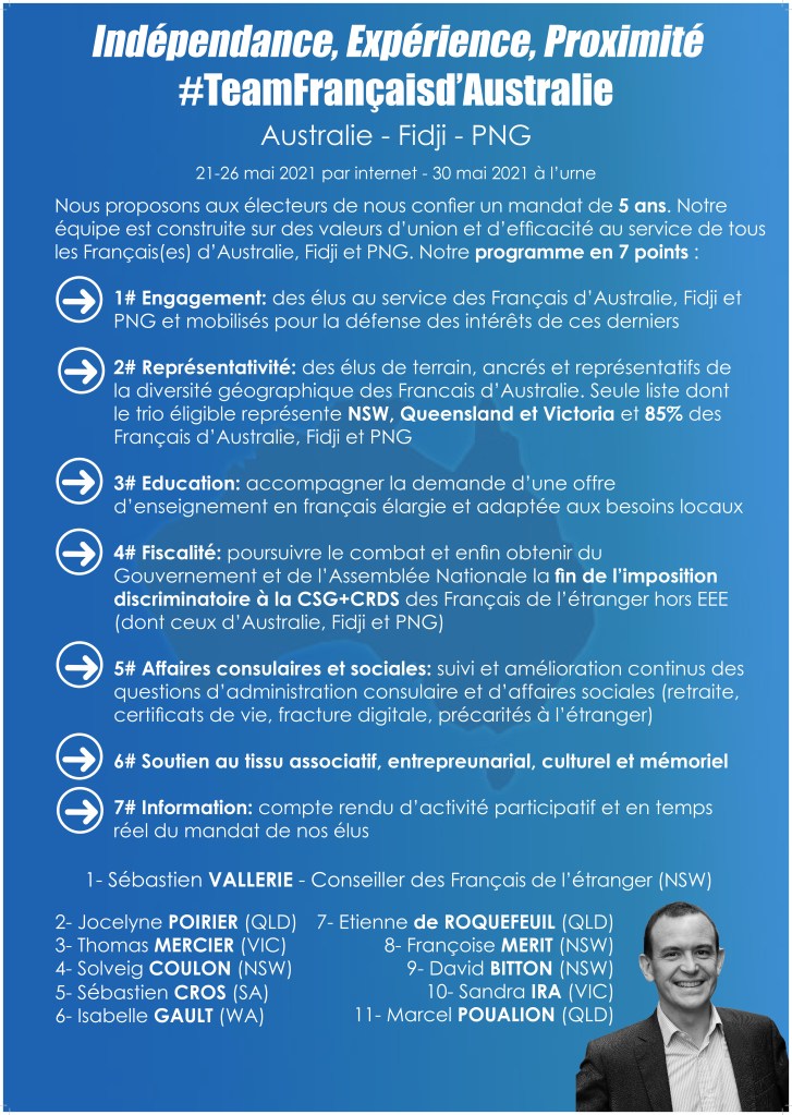 Nous sommes des élus de terrain, ancrés et représentatifs de la diversité géographique des Français d’Australie. Seule liste dont le trio éligible représente NSW, Queensland et Victoria et 85% des Français d’Australie, Fidji et PNG.